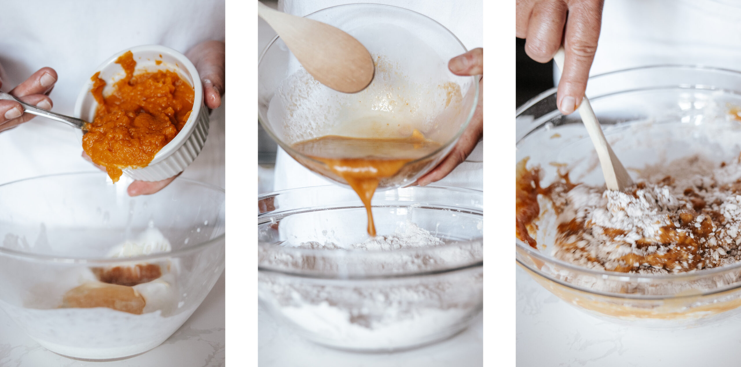 Whisk the buttermilk, egg, pumpkin puree, brown sugar and vanilla together in another bowl. Add wet mixture to dry mixture, then combine together with fork or wooden spoon until everything appears to be moistened well.